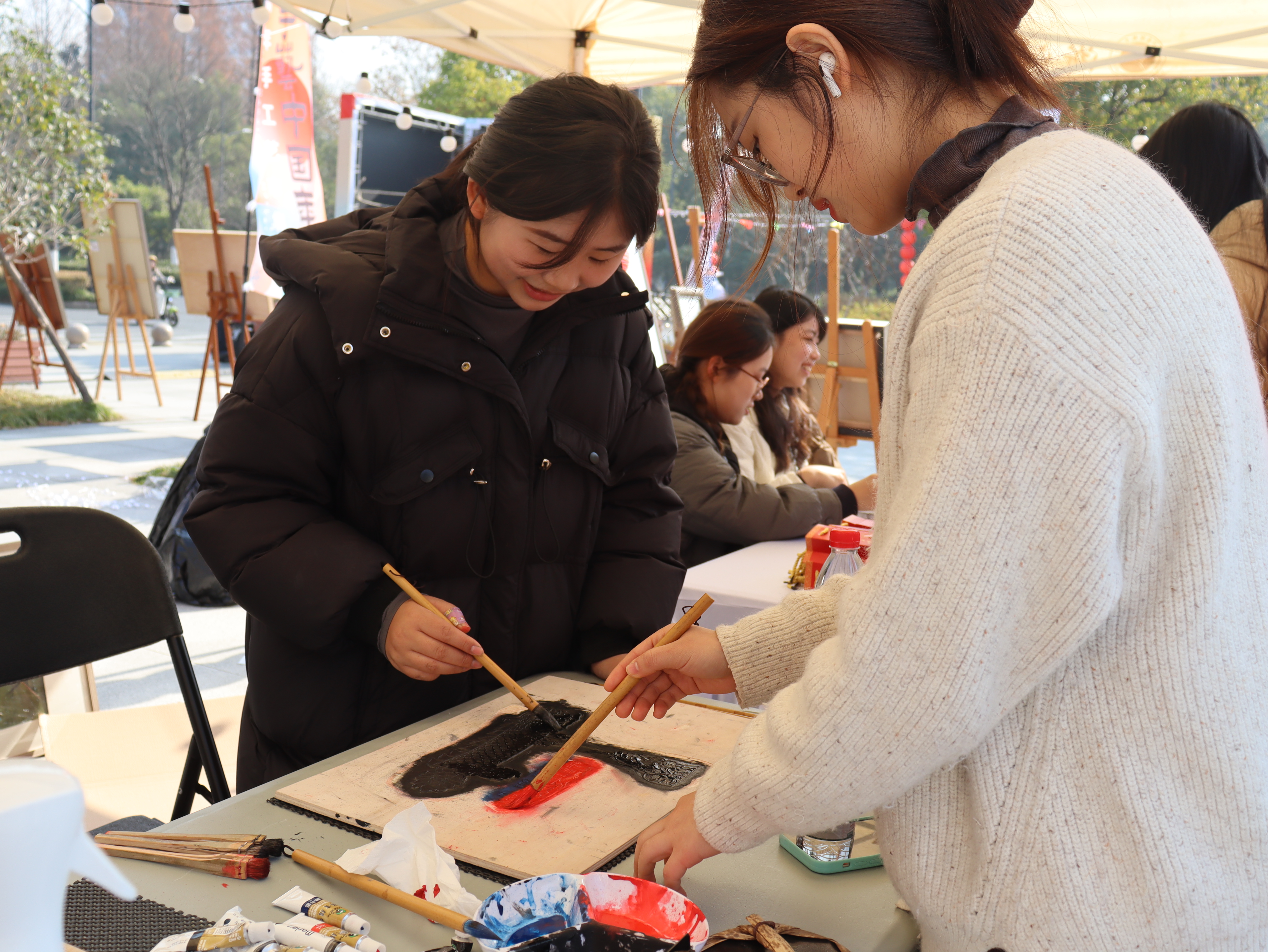 同学们在市集中交流艺术、共享创意。现场气氛热烈,人声鼎沸,大家脸上都洋溢着笑容。