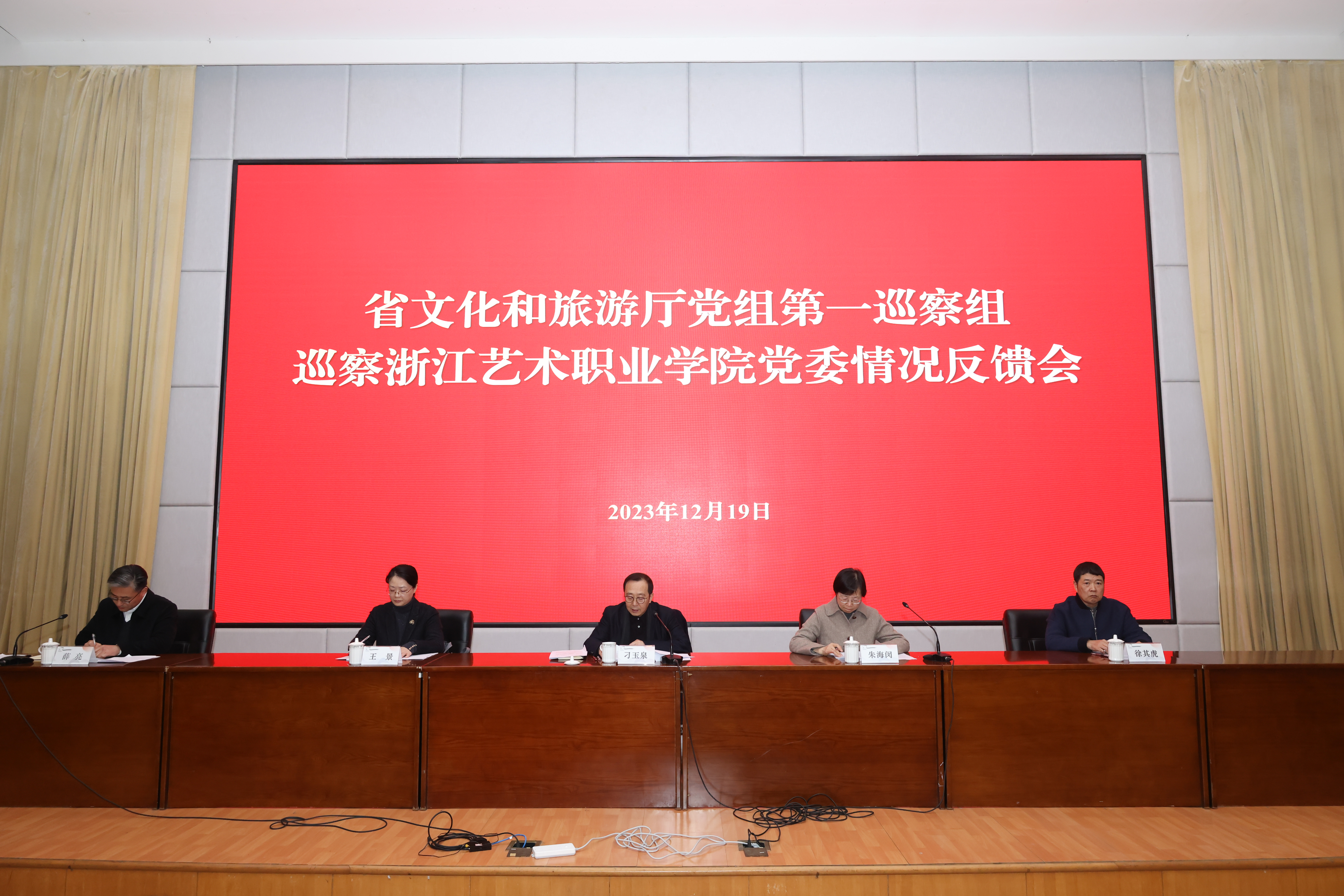 根据省委巡视工作统一部署,省文化和旅游厅党组统筹安排,12月19日,省文化和旅游厅党组第一巡察组巡察浙江艺术职业学院党委情况反馈会在我校图信报告厅召开。厅党组第一巡察组组长、厅党组成员、副厅长刁玉泉作巡察情况反馈,厅党组巡察工作领导小组办公室主任、厅党组成员、副厅长朱海闵对党委抓好巡察整改工作提出要求,校党委书记薛亮主持会议并就做好巡察整改工作表态发言。会前,刁玉泉主持召开会议,向学校党委书记薛亮反馈了巡察情况。
