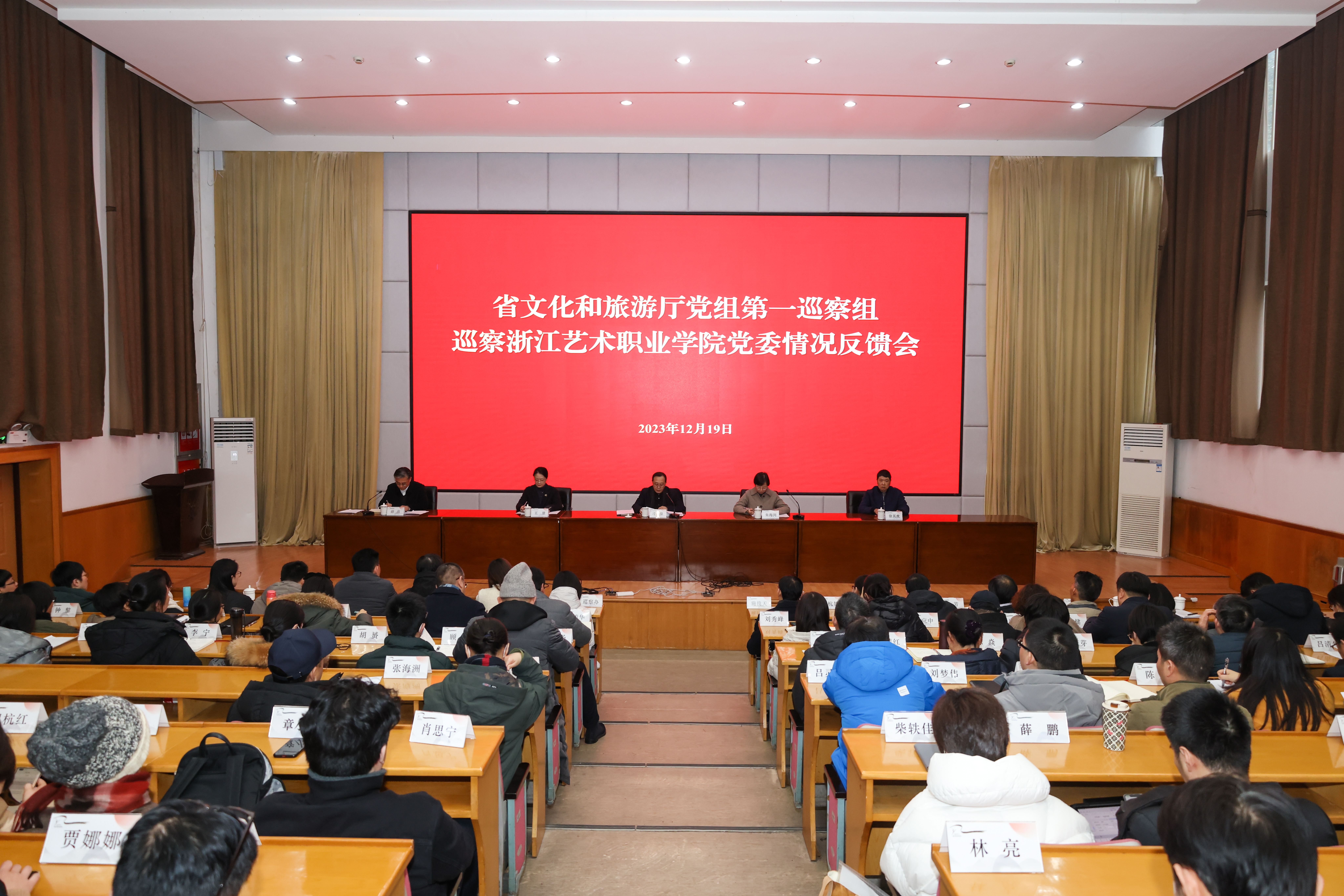 厅第一巡察组副组长王景、徐其虎,厅巡察工作领导小组办公室俞冰清,厅第一巡察组全体成员,浙江艺术职业学院党委领导班子成员,副处级以上干部,副高职称以上教师,民主党派负责人,教代会主席团成员,近五年退休的党委班子成员参加会议。