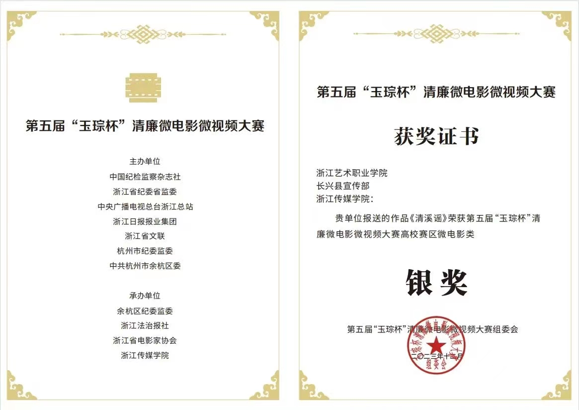 近日,第五届“玉琮杯”清廉微电影微视频大赛在杭州圆满落幕,经过激烈角逐,我校参赛作品《净·铅华》《清溪谣》分别荣获高校赛区微电影类金奖和银奖。