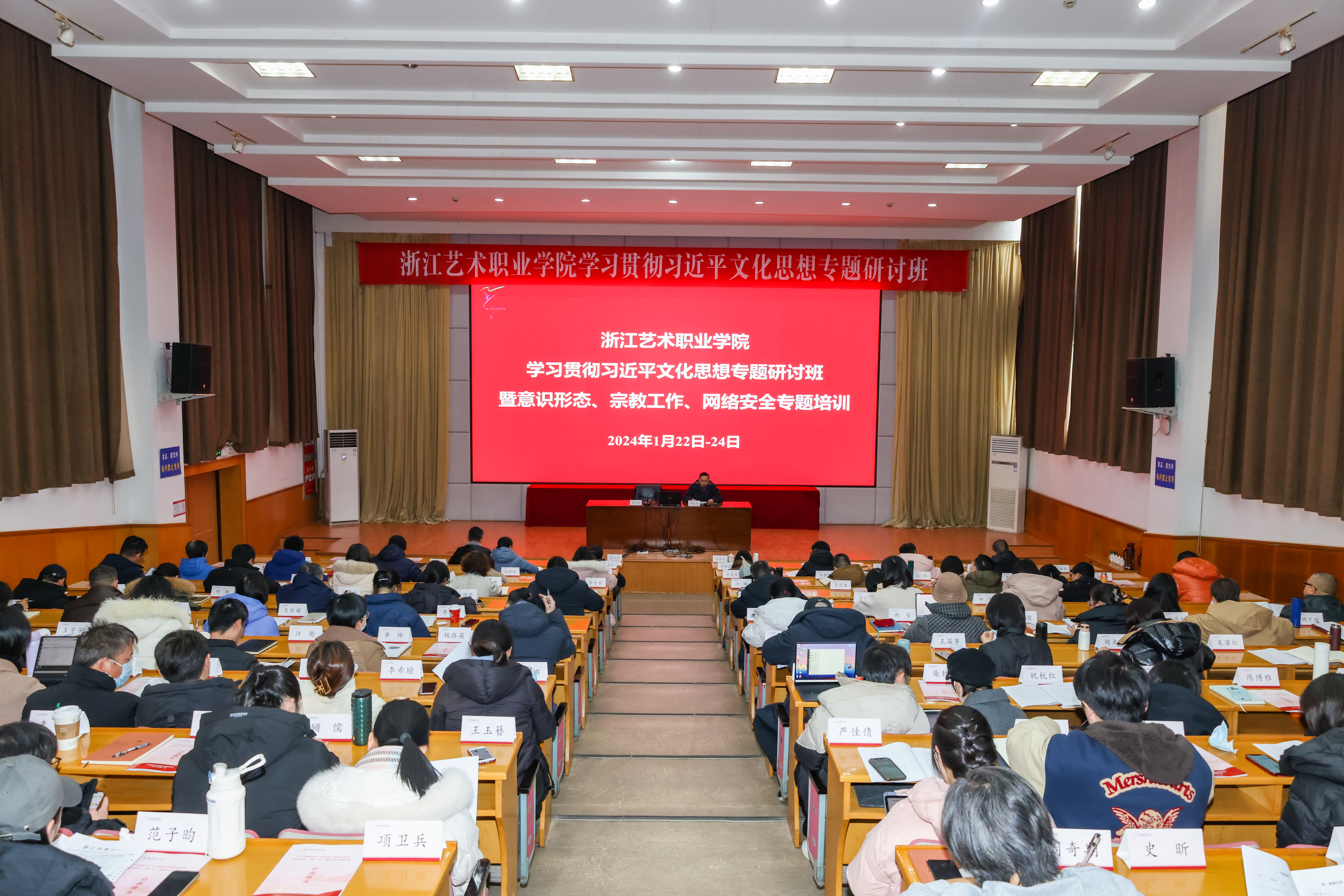 为建立学习贯彻习近平文化思想长效机制,全面贯彻落实全国、全省宣传思想文化工作会议精神,持续推进党员干部深入学习贯彻习近平文化思想,切实做到明体达用、体用贯通,1月22日,浙江艺术职业学院学习贯彻习近平文化思想专题研讨班开班仪式在学校图信报告厅举行。校党委班子成员、中层领导人员、主管岗位管理人员、基层党支部书记、马克思主义学院专任教师、辅导员、班主任代表等近150人参加。