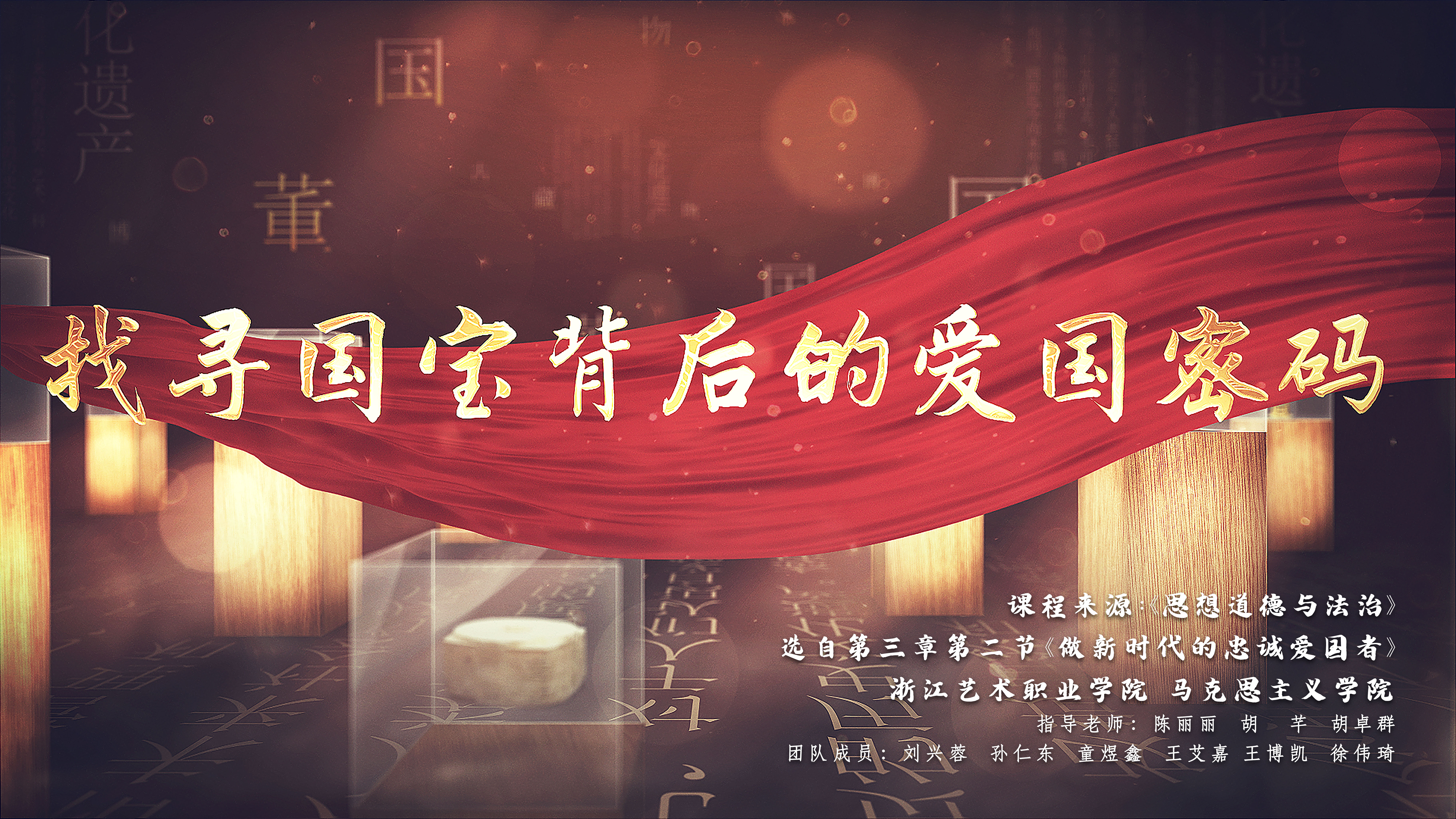 公开课展示团队成员由刘兴蓉(22影视编导班)、孙仁东(22戏剧影视表演1班)、童煜鑫(22戏剧影视表演1班)、王艾嘉(22戏剧影视表演1班)、王博凯(22影视多媒体2班)、徐伟琦(22影视多媒体2班)六位同学组成,在马克思主义学院陈丽丽、胡芊、胡卓群三位指导教师的精心指导下,选取《思想道德与法治》第三章“继承优良传统 弘扬中国精神”中第二节“做新时代的忠诚爱国者”进行内容架构,通过走进浙江省博物馆(之江馆区),寻找四件“镇馆之宝”——战国越王者旨於睗剑、元黄公望富春山居图卷、新石器时代良渚玉琮王、朱金木雕宁波花轿(万工轿)——实施了一堂“博物馆里的思政课”,用文物故事解码新时代的爱国主义,增强文化自信,践行爱国誓言。经过师生团队共同努力,作品突出重围,斩获佳绩。