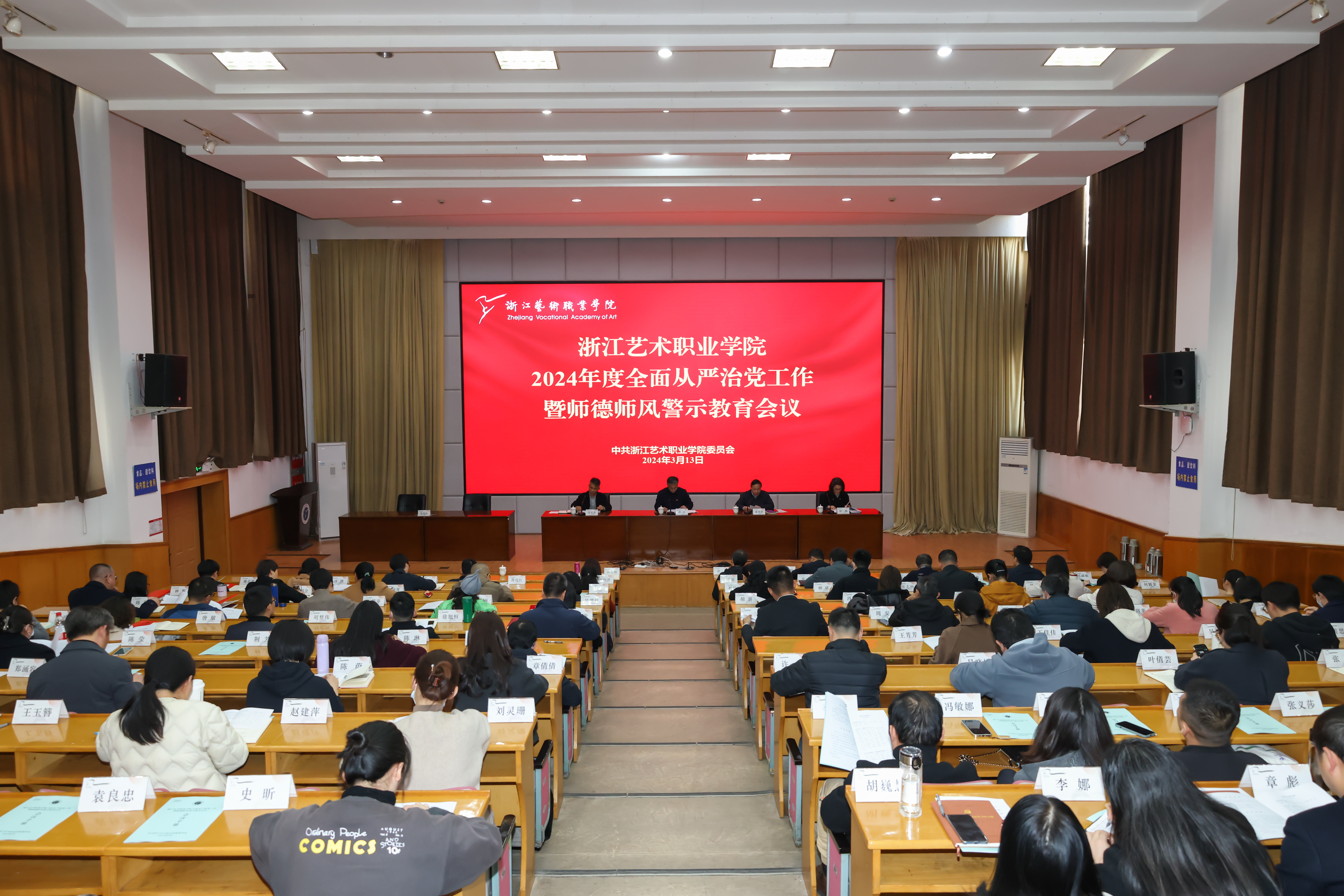 3月13日,浙江艺术职业学院召开2024年全面从严治党工作暨师德师风警示教育会议,学习贯彻二十届中央纪委三次全会、省纪委十五届三次全会和省文化广电和旅游系统干部大会暨党建和党风廉政工作会、全省教育系统全面从严治党暨清廉学校建设推进会等会议精神,全面回顾总结学校2023年工作,研究部署2024年全面从严治党重点工作,为推动学校“十四五”高质量发展提供更加坚实的政治保障。