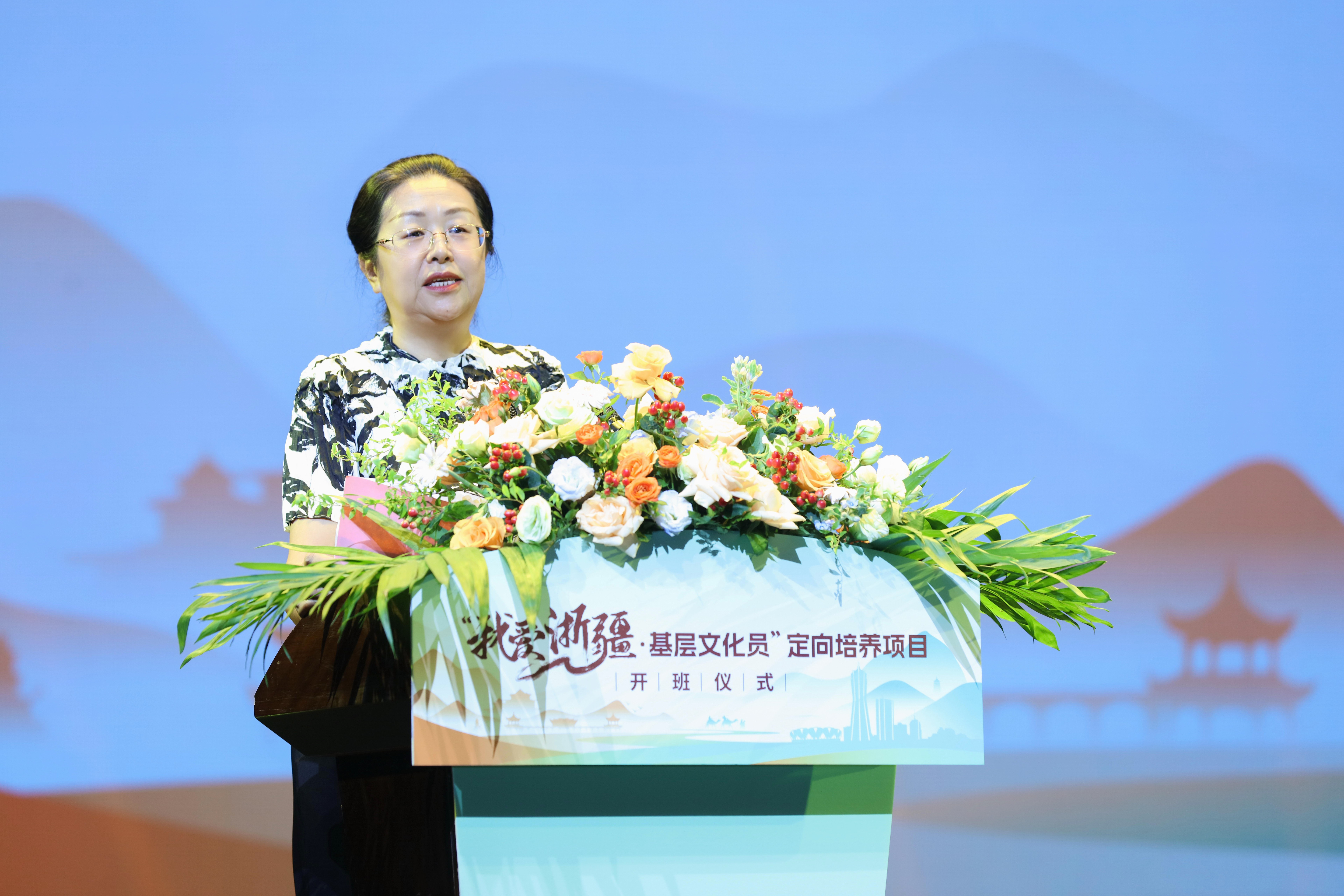 来颖杰代表浙江省委宣传部对项目的启动表示热烈祝贺。他指出,乡镇文化员定向培养是浙江省2017年推出的一项重大制度创新,旨在更好地建强基层公共文化服务人才队伍。多年的实践表明,浙江乡镇文化员定向培养已成为深化“千万工程”建设的重要抓手,也是丰富基层群众文化共富、精神富有的民生项目。浙江艺术职业学院作为培养单位,已招收七届共331名定向生,形成了许多可复制、可借鉴、可推广的经验做法。“我爱浙疆·基层文化员”项目由浙江艺术职业学院与新疆理工学院合作开展,恰逢其时,意义重大,有望为援疆再添新亮点、为文化润疆再创新模式。该项目不仅是文化的双向交流,更体现了两地的深厚合作。他强调,“文化润疆”架起的是民心之桥,应深化两地人文交流,做强品牌载体,提升群众获得感,并建立长效培养机制,持续创新模式,确保每位文化员都能担当起以文惠民、以文兴业、以文润村的重任。