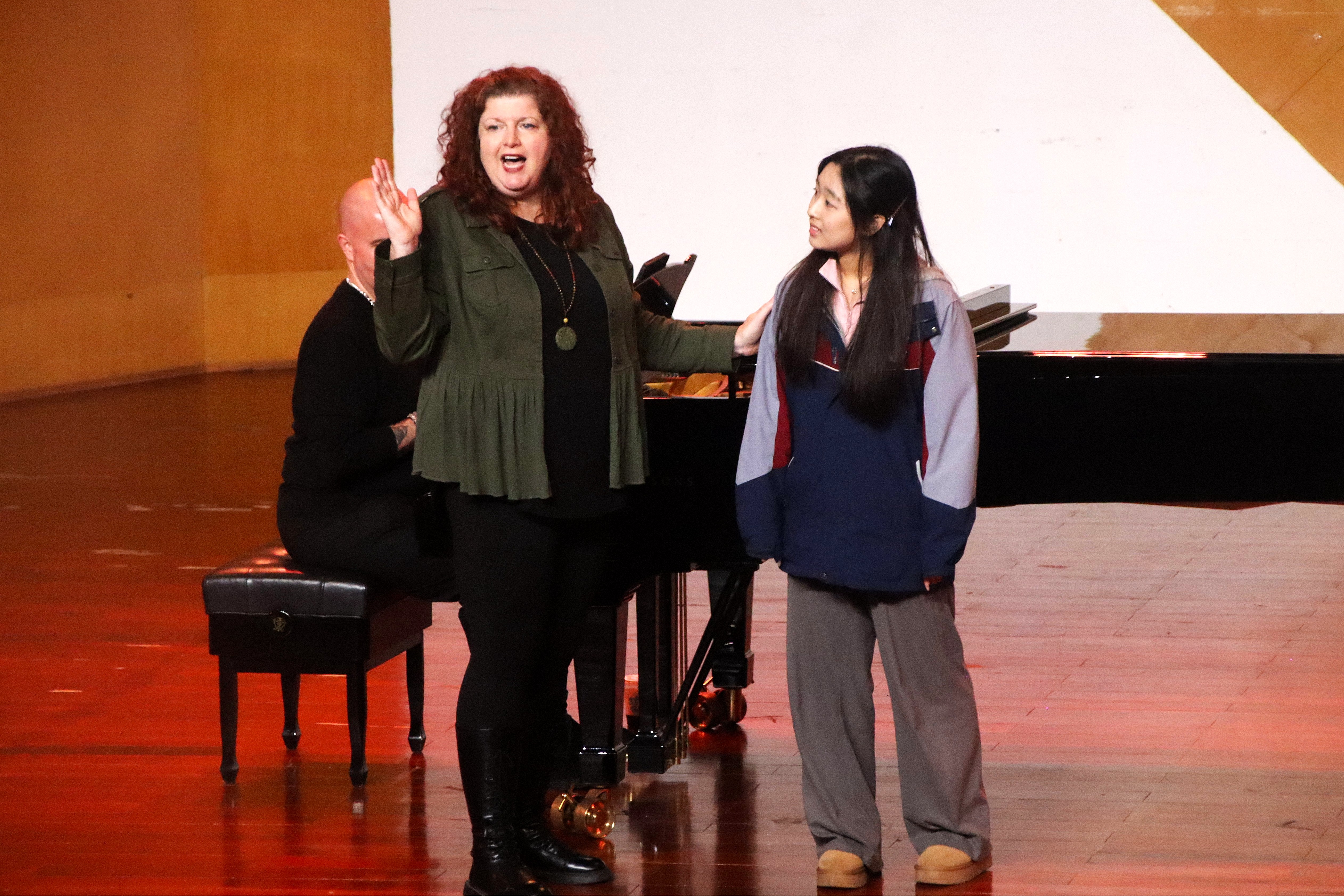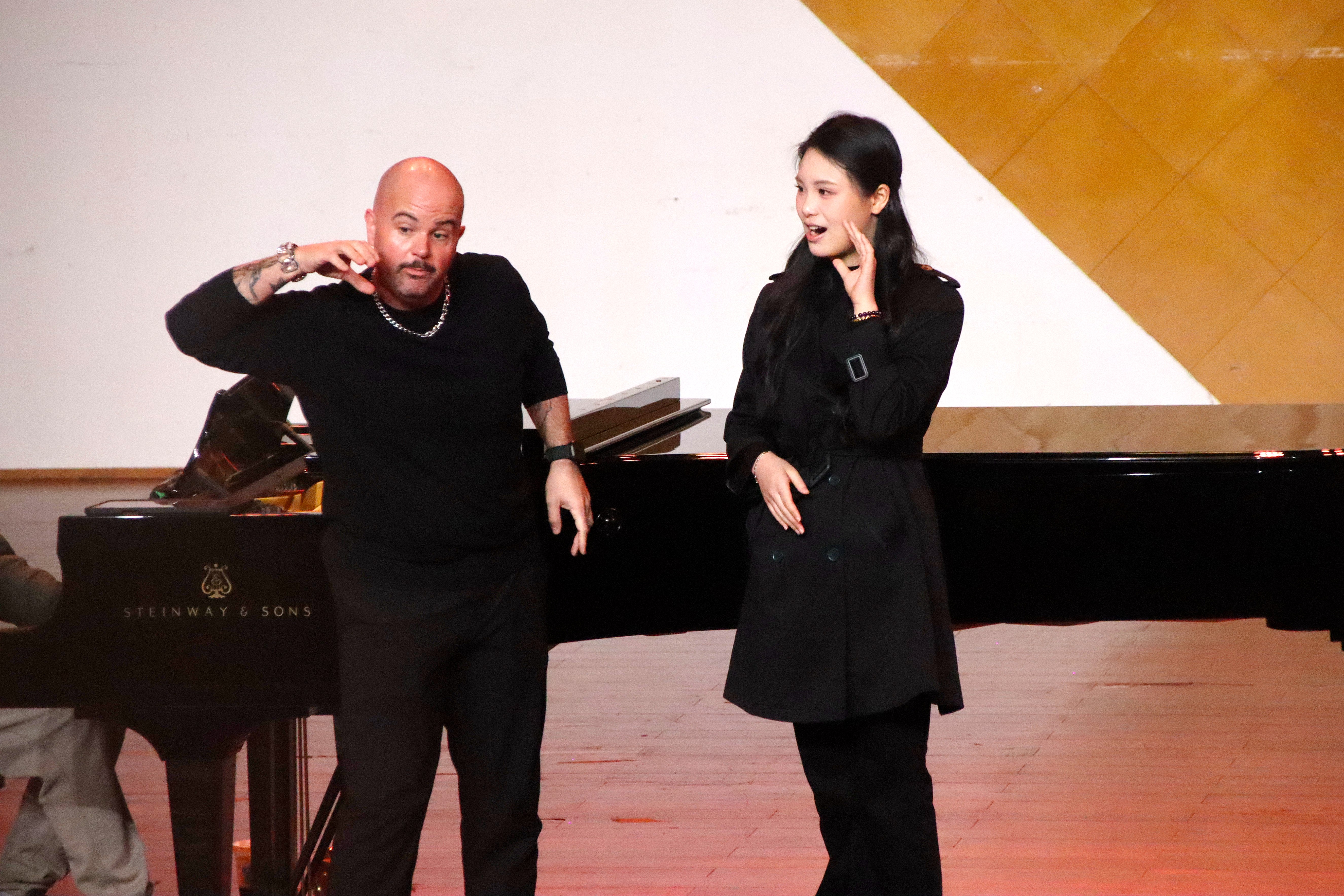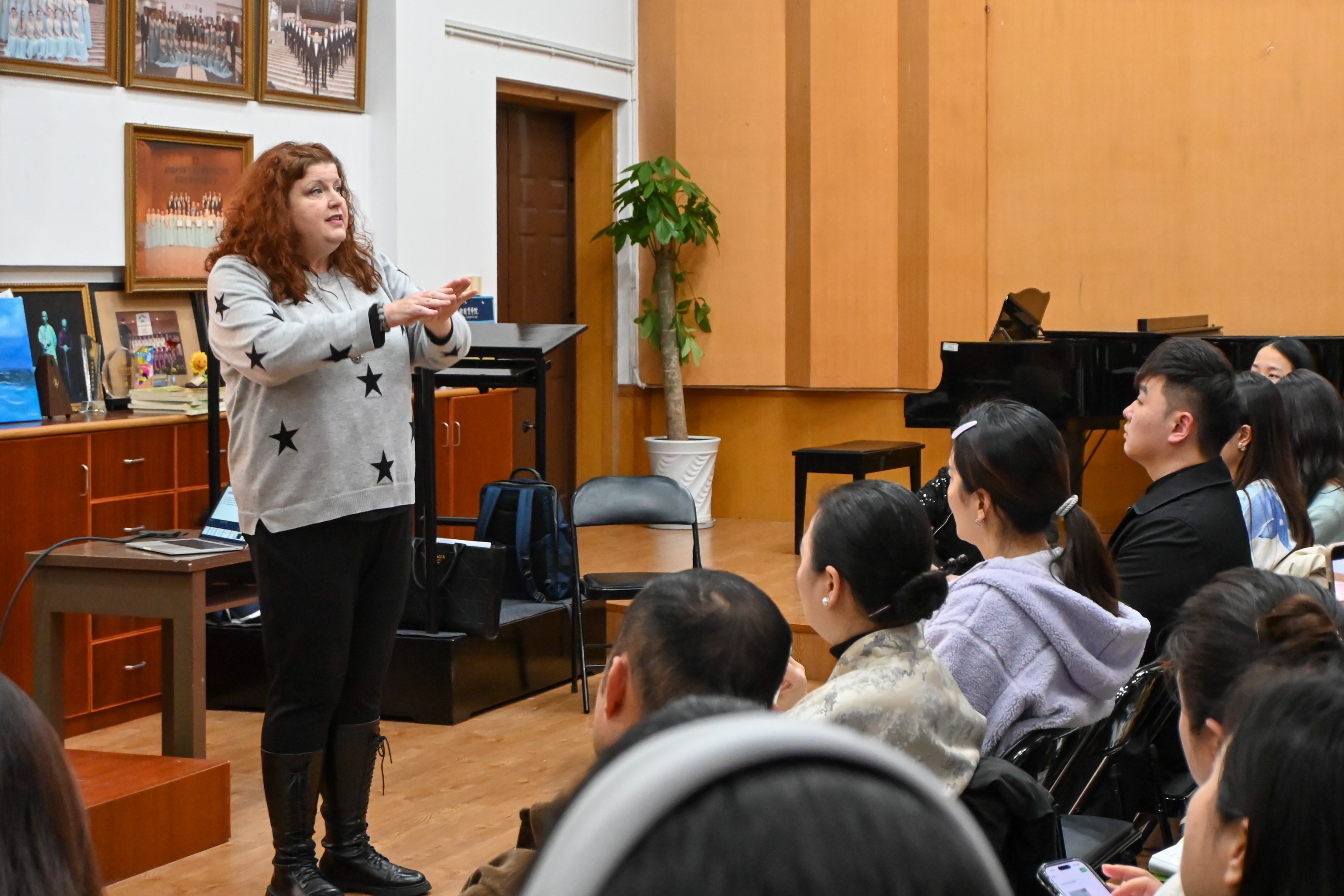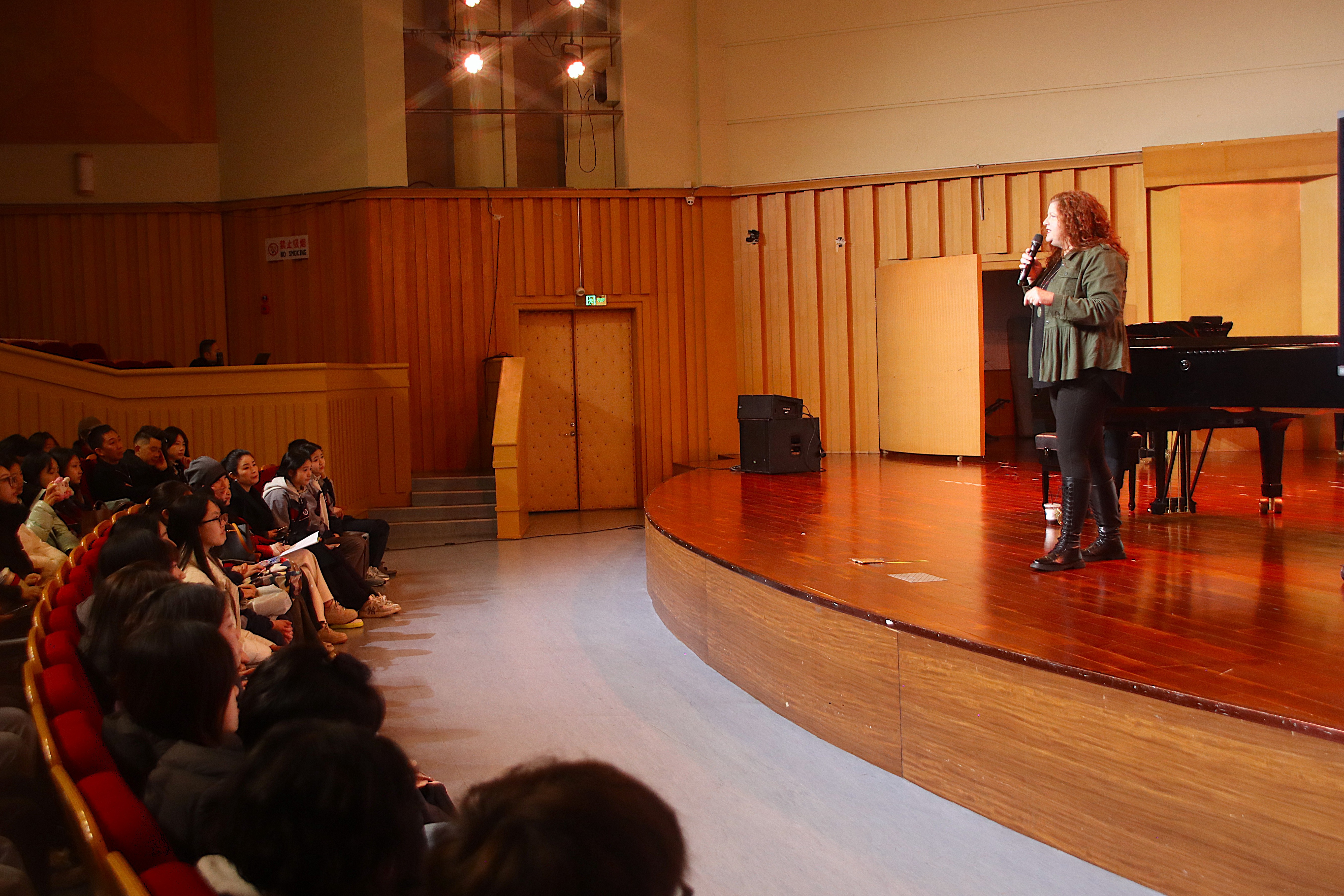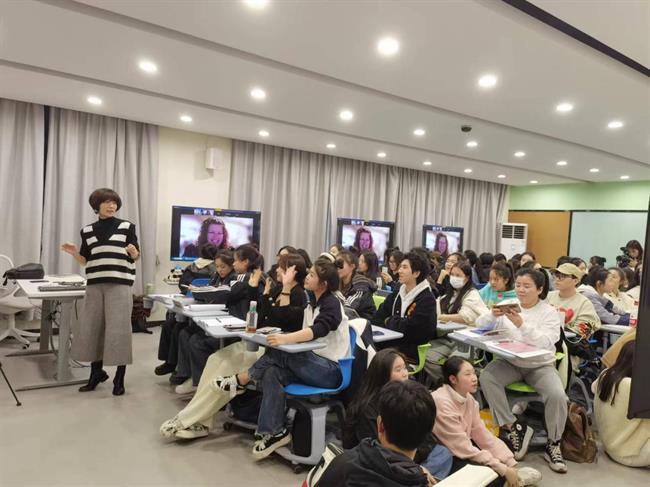 交流期间,科琳·奈斯教授分别在音乐学院合唱教室和音乐厅进行了第五次授课。她声情并茂地讲解、演示,并与现场师生积极互动,充分展现了音乐艺术的独特魅力,激发了大家对音乐更深层次的热爱和理解。科琳·奈斯教授不仅分享了最新的“Estill声音功能性训练”理念,还亲自指导学生如何在表演中融入情感,提升表现力。课堂上,师生们热情高涨,积极参与,整个氛围充满了活力。大家都被科琳·奈斯教授的专业素养和教学热情所感染,收获满满。