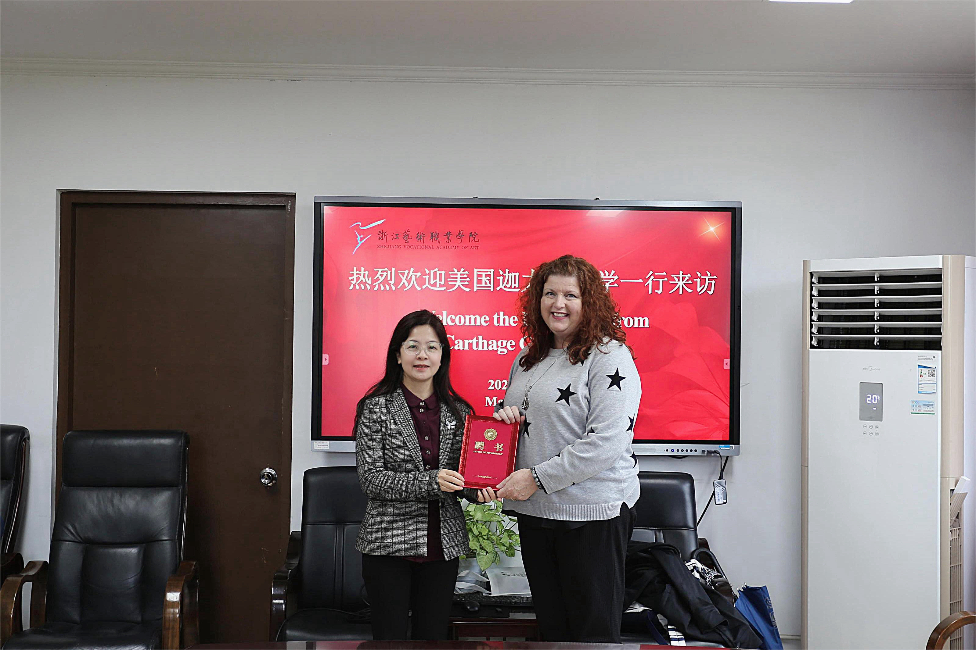 在这个春意盎然的季节里,浙艺迎来了一批远道而来的贵客——美国迦太基大学艺术与人文学院院长科琳·奈斯(Corinne Ness)教授和迦太基大学音乐戏剧与音乐教育主任马修·霍兰德(Matthew Hougland)教授一行。他们在此开启为期四天的访问交流。副校长刘秀峰在欢迎仪式上,对他们的到来表达了最诚挚的欢迎与期待。科琳·奈斯教授也欣然接过聘书,成为我校国际学院客座教授。