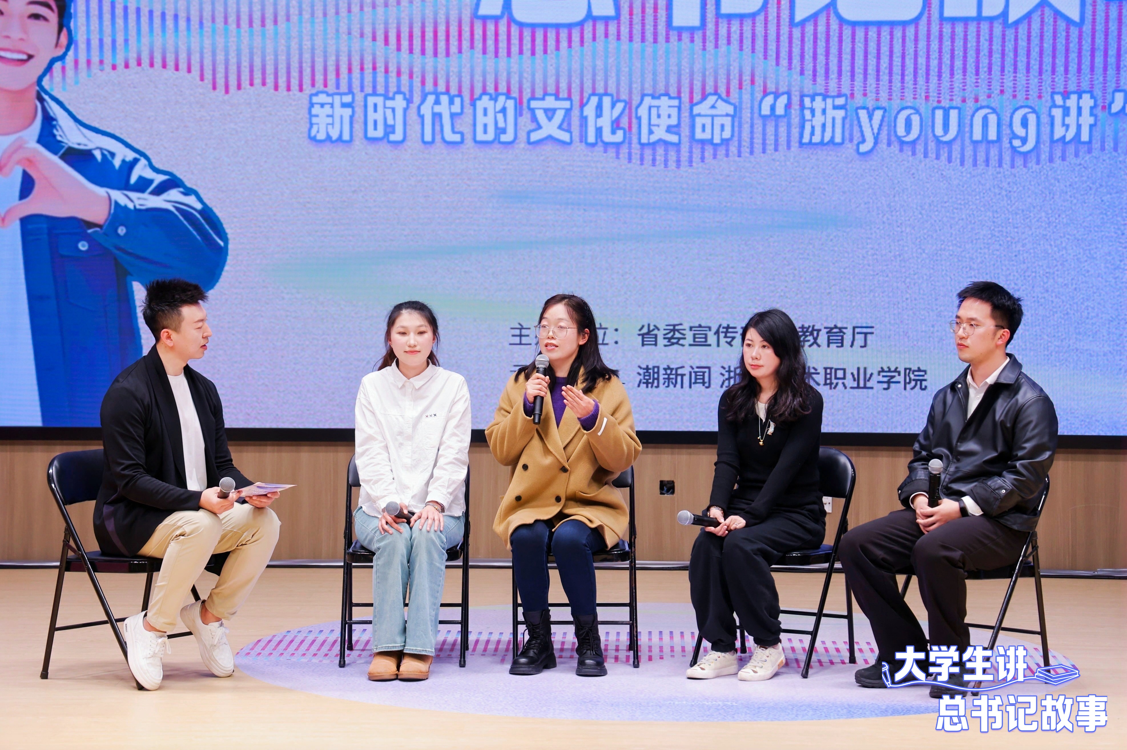 3月5日下午,“大学生讲总书记故事”系列活动在浙江艺术职业学院举办。作为系列活动的首场,活动聚焦新时代的文化使命这一主题,由来自浙江大学、浙江工业大学和杭州师范大学等高校的6组宣讲员用开放麦、情景剧、AI互动等年轻人喜闻乐见的方式,以满满“青春味”和“科技味”的表达,为全校近300名师生上了一堂别开生面的“思政课”。