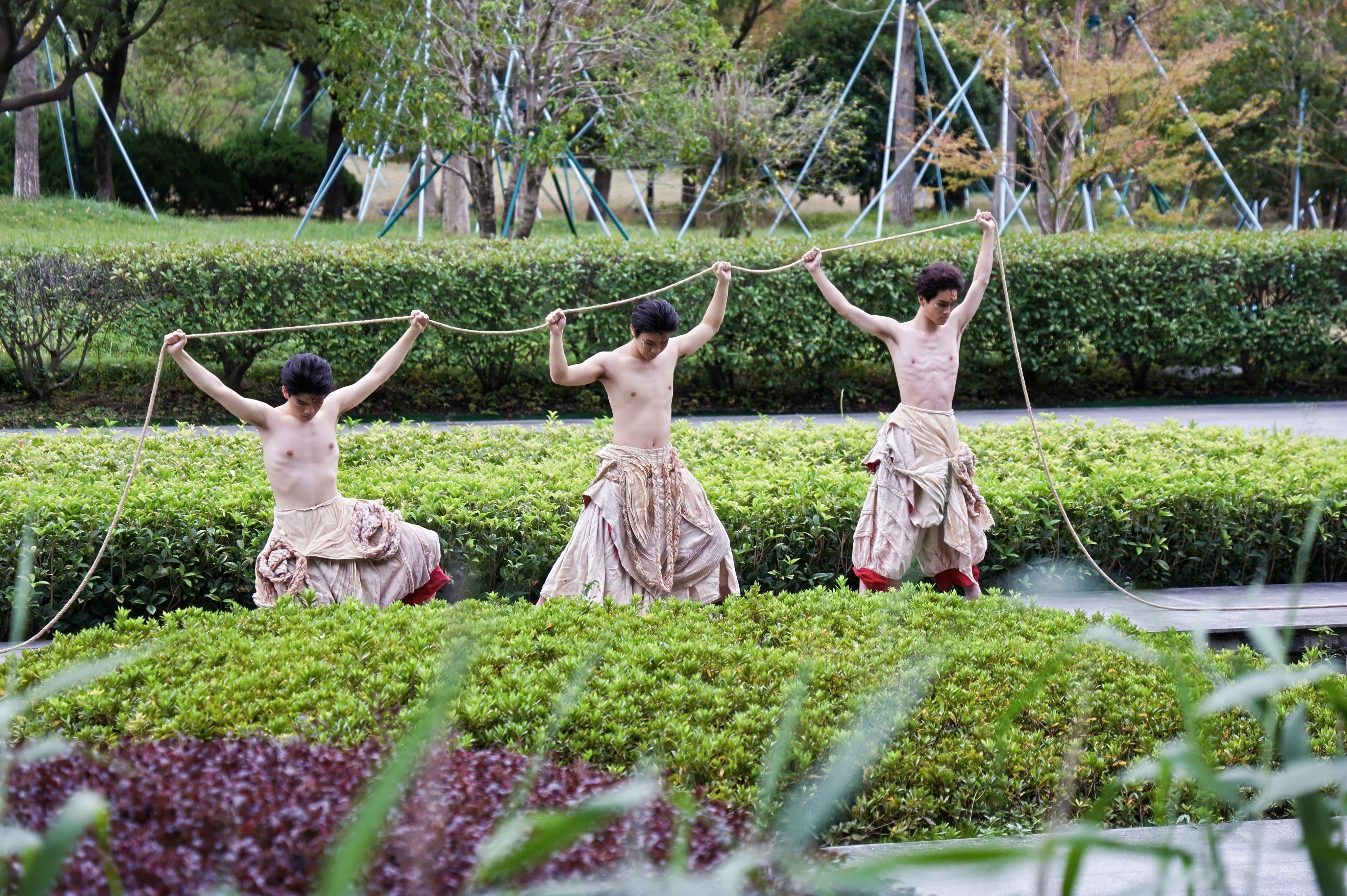 在本次《行舟》的创作与执行中,我校组建跨院系、多维度核心团队,实现教学资源与艺术实践的深度融合。舞蹈学院编导教师李毅源担任总导演,凭借深厚编创功底与对环境舞蹈的独到理解,统筹整体艺术构思,巧妙将跨湖桥文明的历史厚重感与现代舞蹈语汇相融共生;青年教师吉日塔、舞蹈学院优秀校友徐妍、汪齐担任执行导演,确保多场域表演连贯流畅、一气呵成;青年教师谭雨旋、吴迪和18位专业学生、众多校友担任主要演员,以扎实专业能力和丰富实践经验,全身心投入表演;戏曲学院江科元、周莉、杨茜,设计学院陈雪瑜等青年教师加入创作组,为作品注入多元艺术表达;23级舞蹈编导专业14名学生担任7个演出点位的导演助理及志愿者,确保演出顺利完成。这支“舞蹈牵头、多院协同、师生联动”的团队,成为本次舞蹈季高质量呈现的核心支撑。