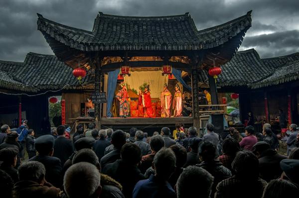 小的时候,戏班子几乎每年都来村里的祠堂表演。在我们的方言里,“戏曲演员”称为“做戏人”,“表演戏曲”称为“做戏”。做戏的头一天晚上,戏班子会带来一个特别的仪式,几个人组成一个小队,带头的做戏人扮成财神爷,手里捧着“大元宝”,绕着村子走一圈,边走边敲锣,示意村民们:村里有戏可以看了。