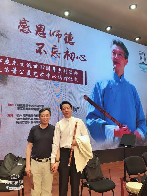 在浙艺院5号楼三楼赵松庭纪念馆内,我和赵松庭先生弟子、我校竹笛教授吴樟华看着照片、文字、曲谱、实物,听着《三五七》《鹧鸪飞》《幽兰逢春》,一起聊着赵松庭先生……