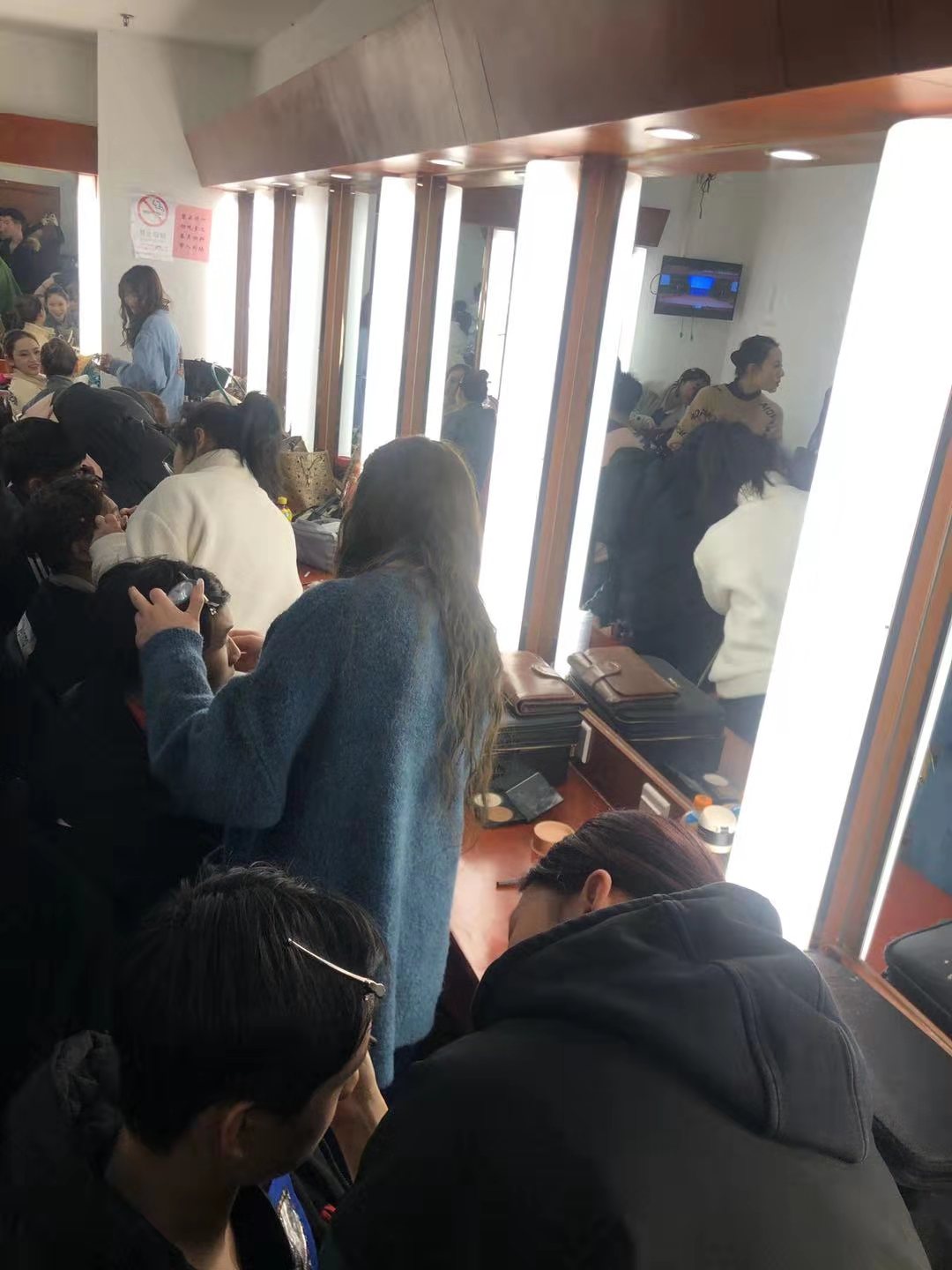 本次化妆和服装道具人员也一刻没闲着,13号就和演员一同去了杭州剧院,为演员彩排化妆,一直到剧院关门。演出当天早上8点半就出发,中午1点开始化妆,直到6点完成220多个演员的化妆,最后手都软了。在演出过程中,由于很多演员在多个节目有表演,所以后台一直处于抢妆状态,换相应的发饰和服装,等演完,大家才松了口气。